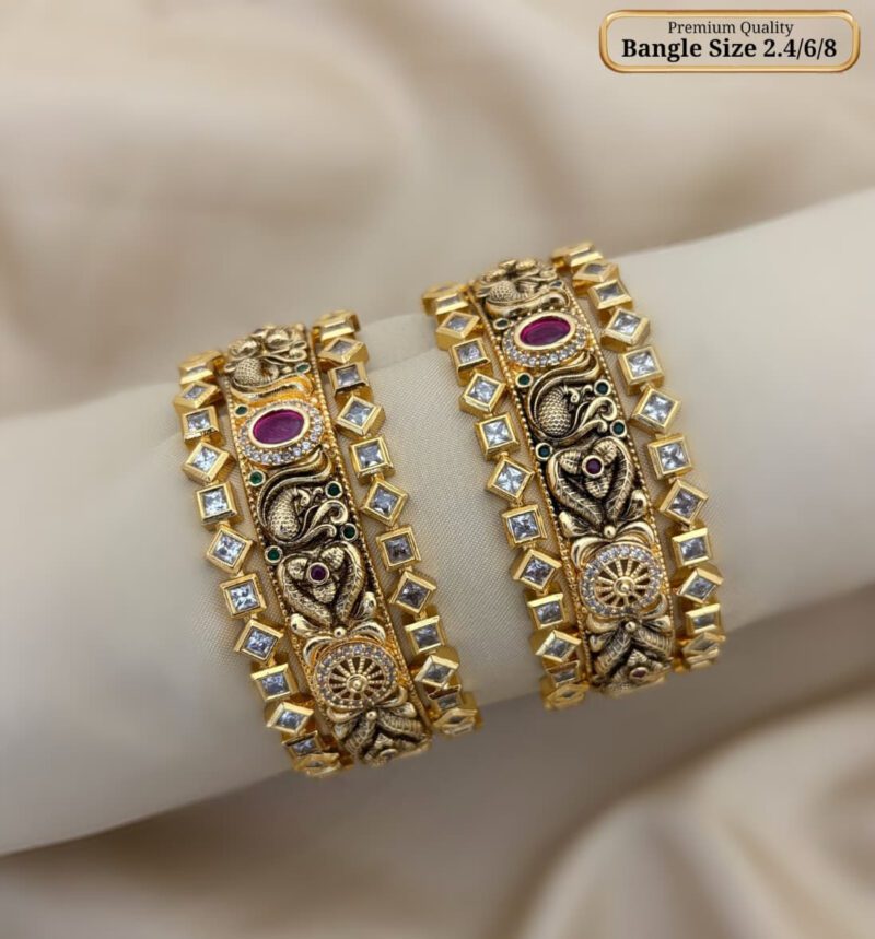 Elegant traditional bangles featuring intricate detailing with sparkling accents—perfect for adding a graceful festive touch to your look.