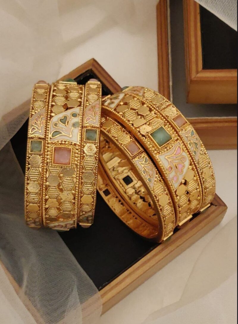 Inspired by heritage artistry, these Kundan bangles showcase exquisite hand-set stones and temple motifs. Rich, intricate, and steeped in tradition—perfect for women who cherish classic Indian craftsmanship.
