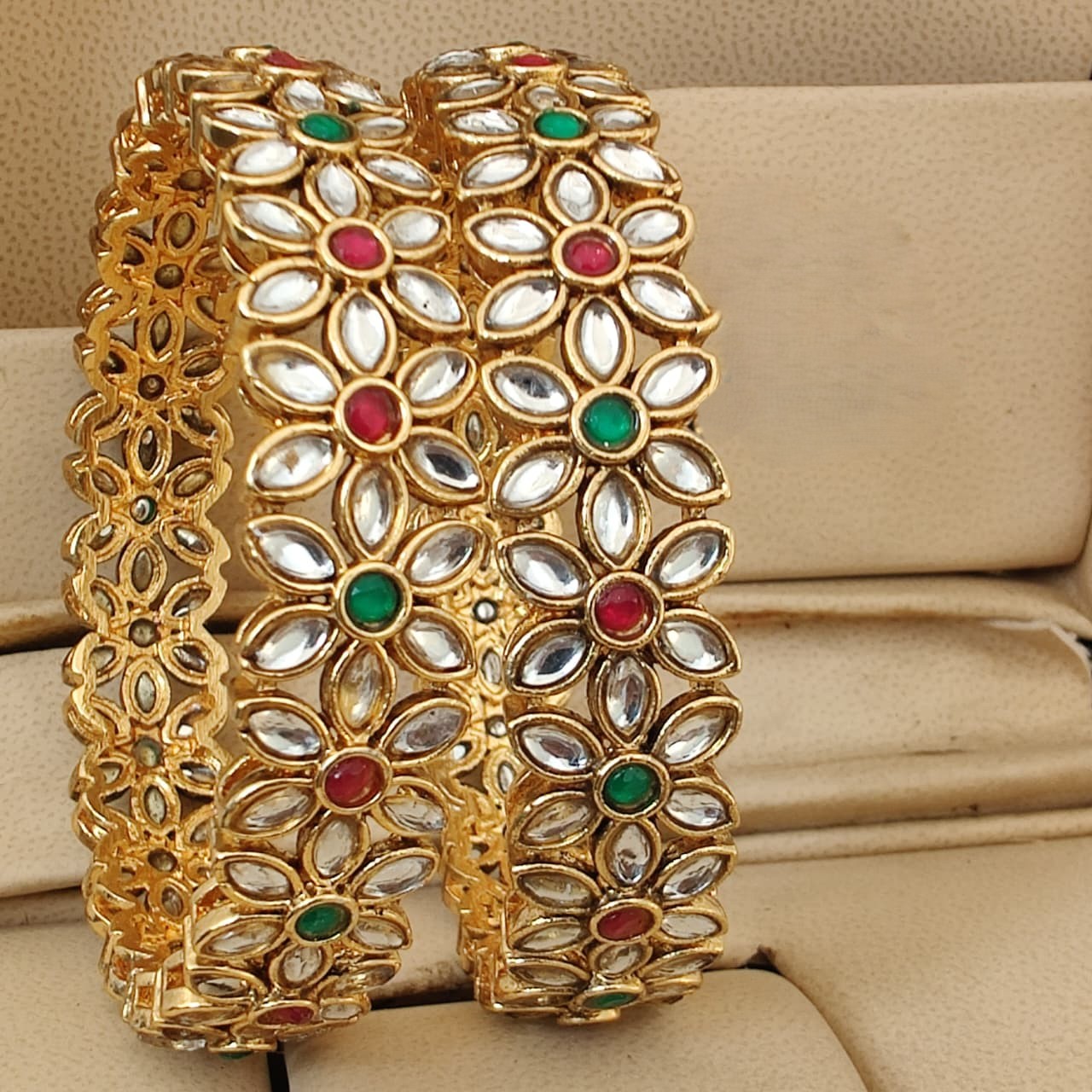Elegant traditional bangles featuring intricate detailing with colored stones and sparkling accents—perfect for adding a graceful festive touch to your look.