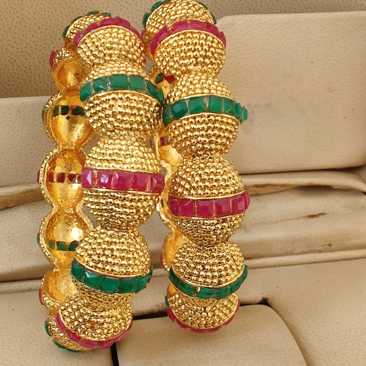 Elegant traditional bangles featuring intricate detailing with colored stones and sparkling accents—perfect for adding a graceful festive touch to your look.