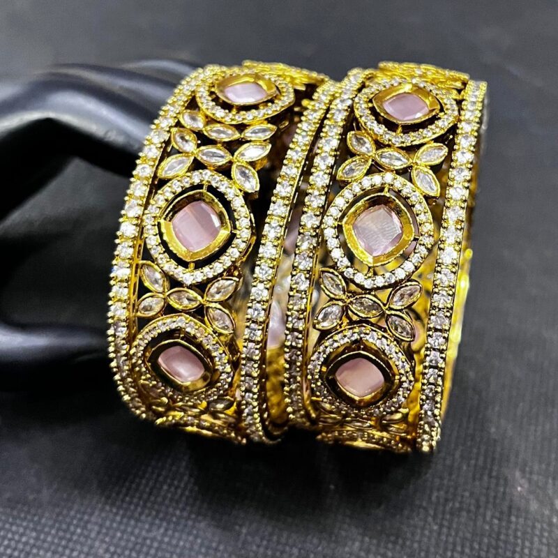 Elegant traditional bangles featuring intricate detailing with colored stones and sparkling accents—perfect for adding a graceful festive touch to your look.