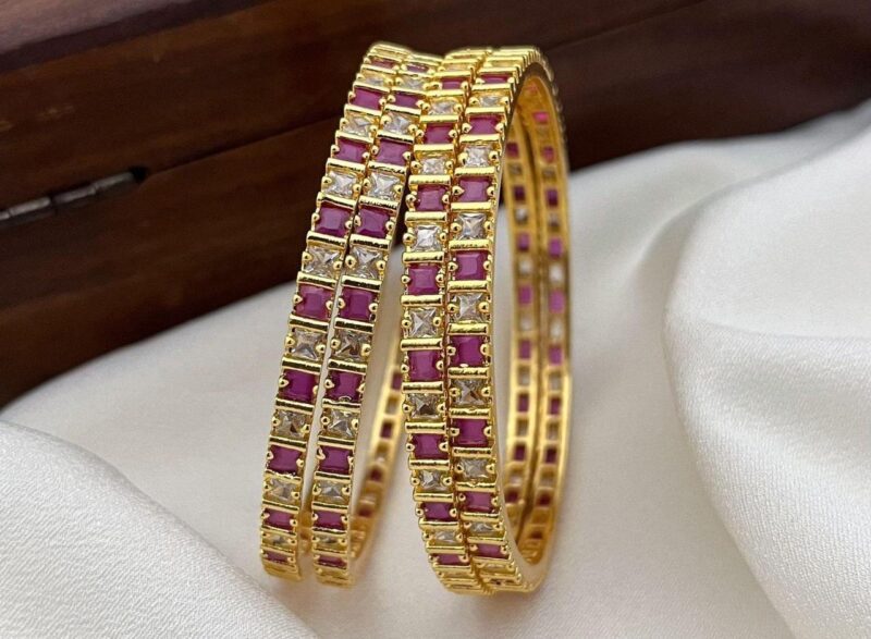 Elegant traditional bangles featuring intricate detailing with colored stones and sparkling accents—perfect for adding a graceful festive touch to your look.