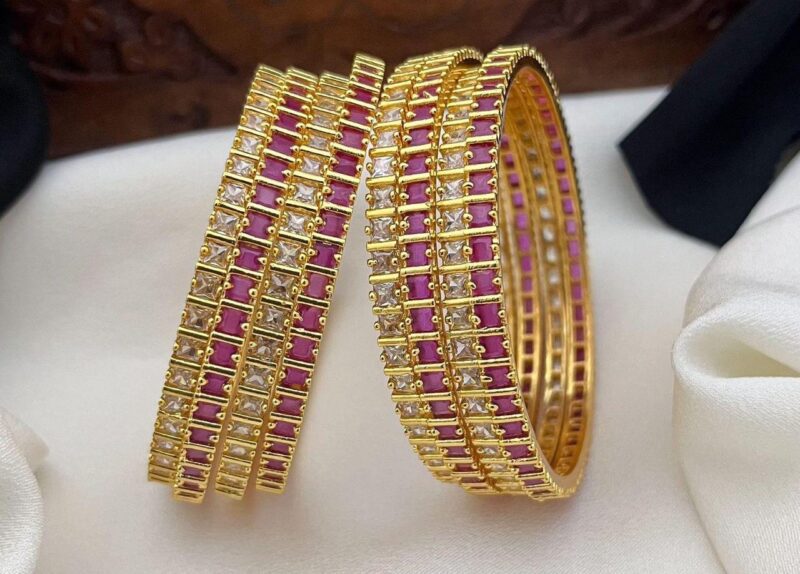 Elegant traditional bangles featuring intricate detailing with colored stones and sparkling accents—perfect for adding a graceful festive touch to your look.