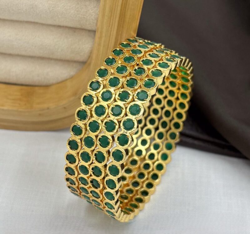 Elegant traditional bangles featuring intricate detailing with colored stones and sparkling accents—perfect for adding a graceful festive touch to your look.