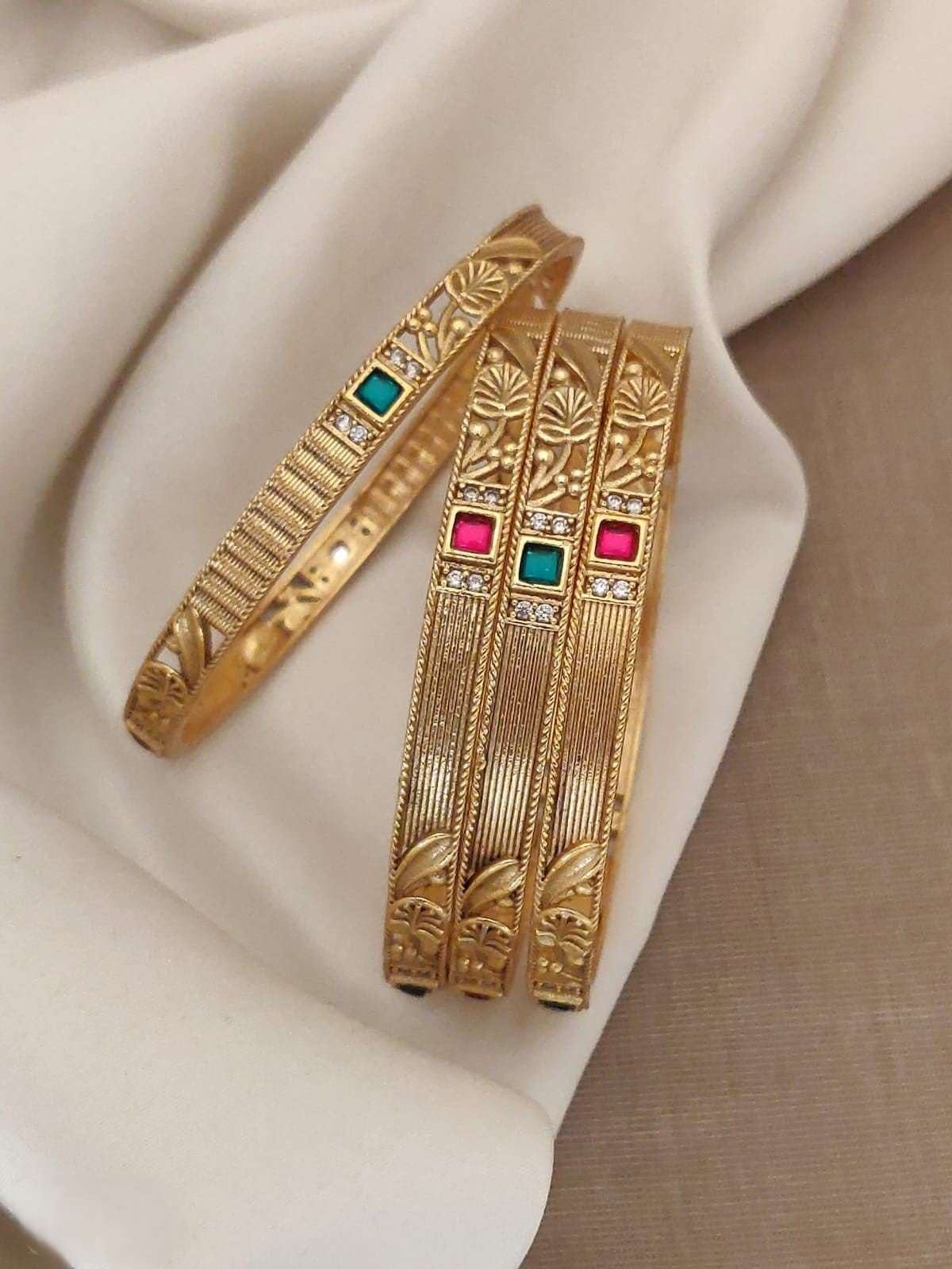 Elegant traditional bangles featuring intricate detailing with colored stones and sparkling accents—perfect for adding a graceful festive touch to your look.