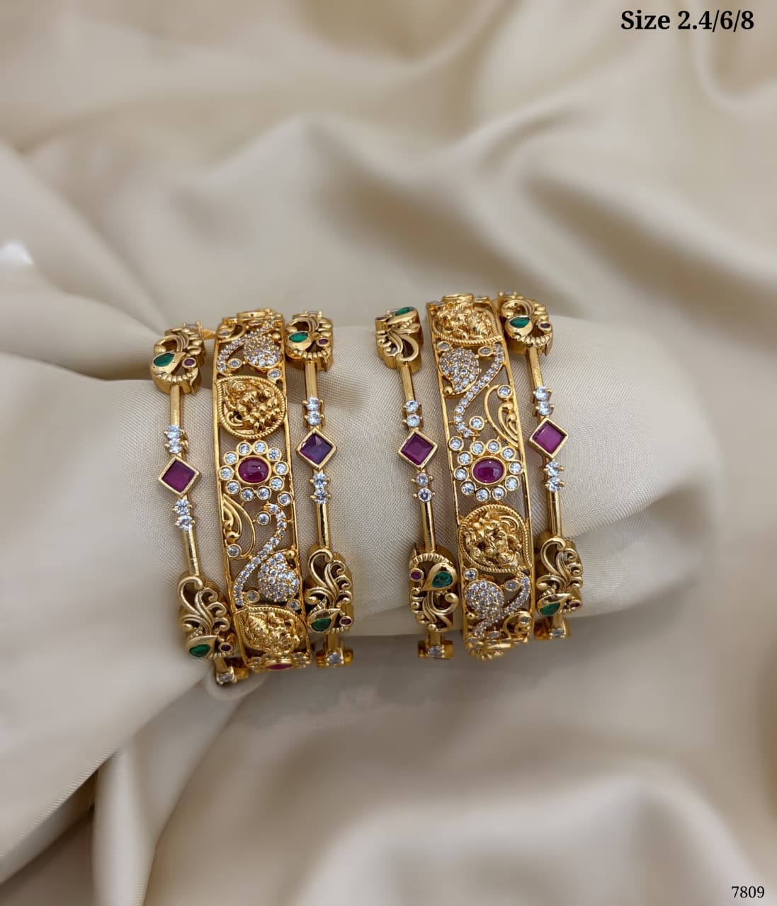 Elegant traditional bangles featuring intricate detailing with colored stones and sparkling accents—perfect for adding a graceful festive touch to your look.