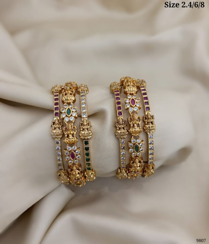 Elegant traditional bangles featuring intricate detailing with colored stones and sparkling accents—perfect for adding a graceful festive touch to your look.