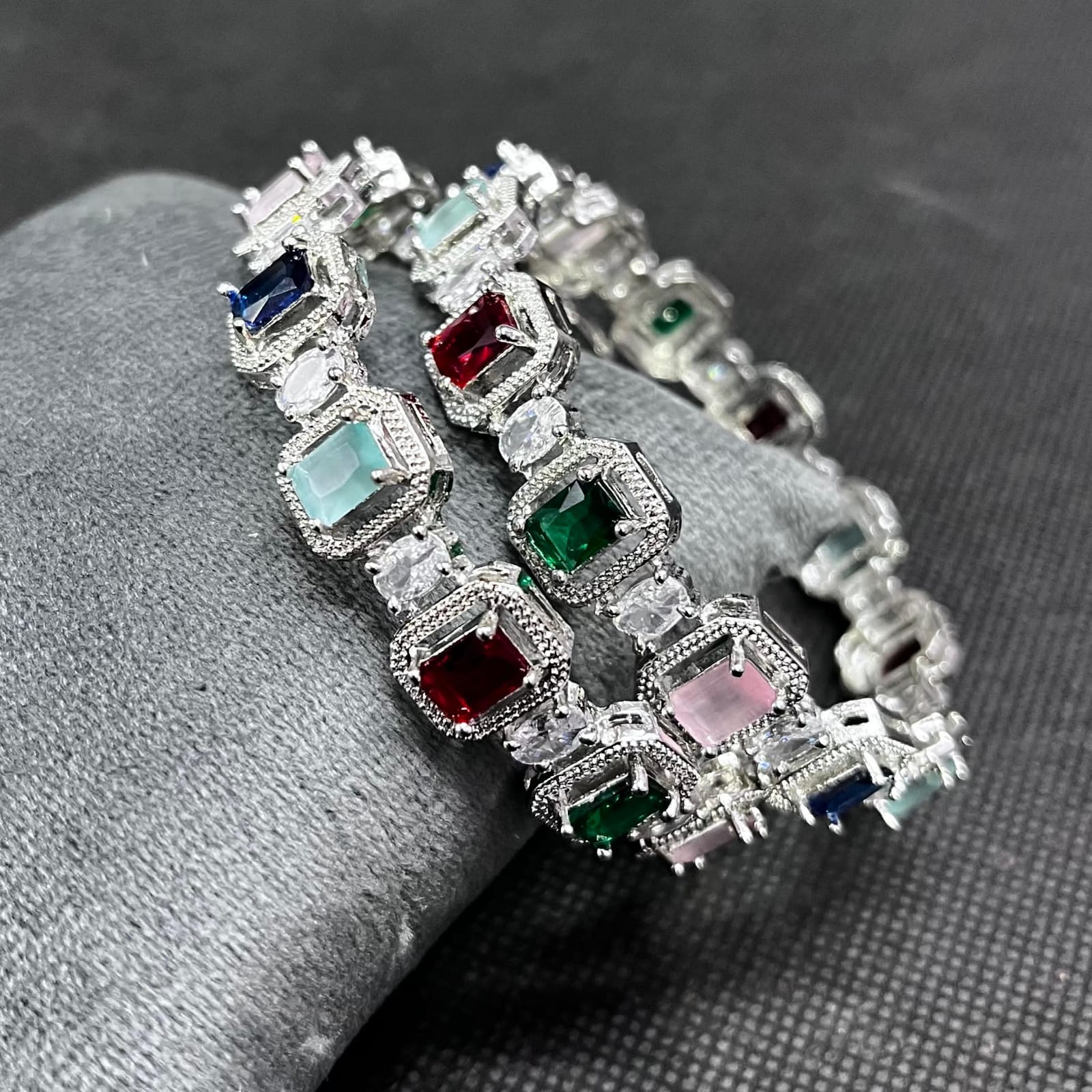 Elegant traditional bangles featuring intricate detailing with colored stones and sparkling accents—perfect for adding a graceful festive touch to your look.