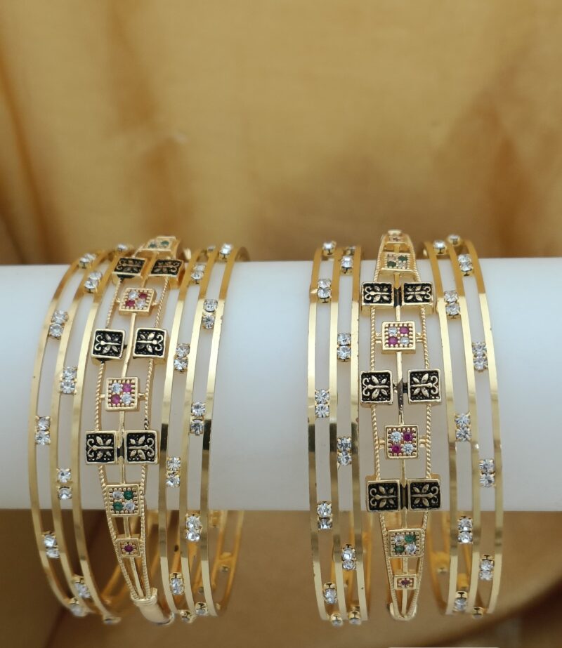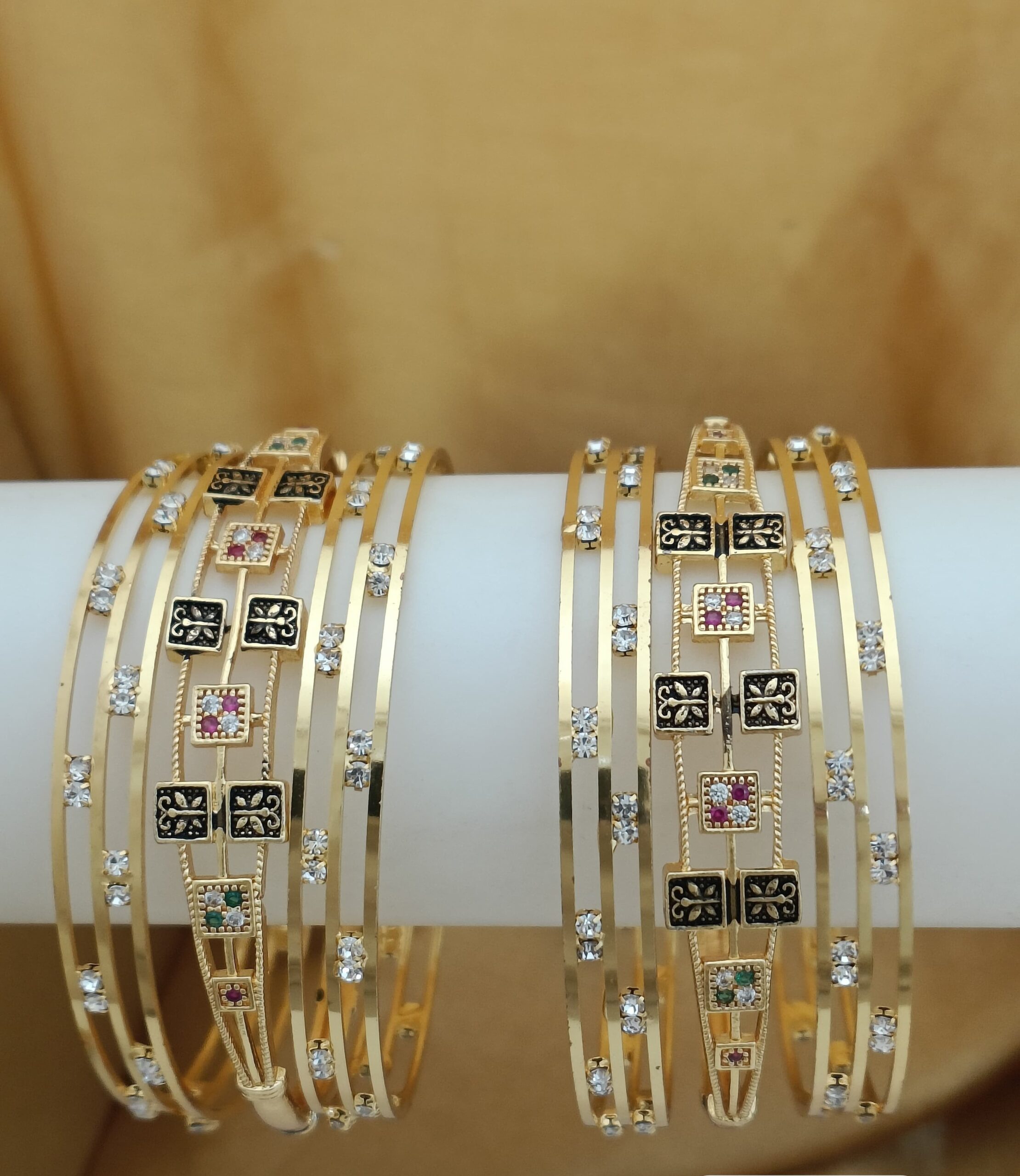 Elegant traditional bangles featuring intricate detailing with colored stones and sparkling accents—perfect for adding a graceful festive touch to your look.
