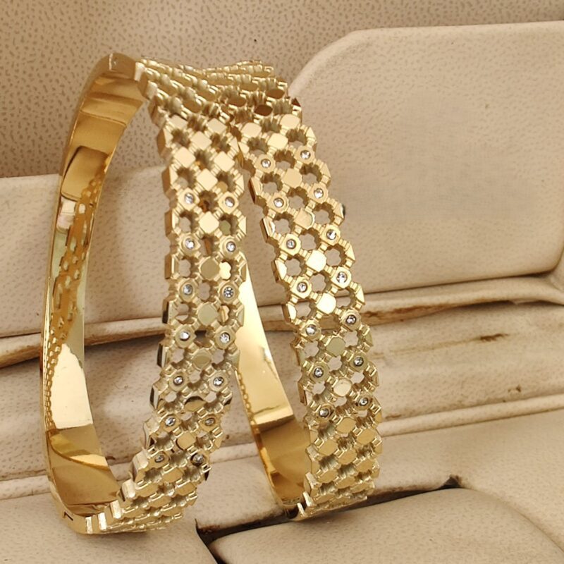 Elegant traditional bangles featuring intricate detailing with colored stones and sparkling accents—perfect for adding a graceful festive touch to your look.