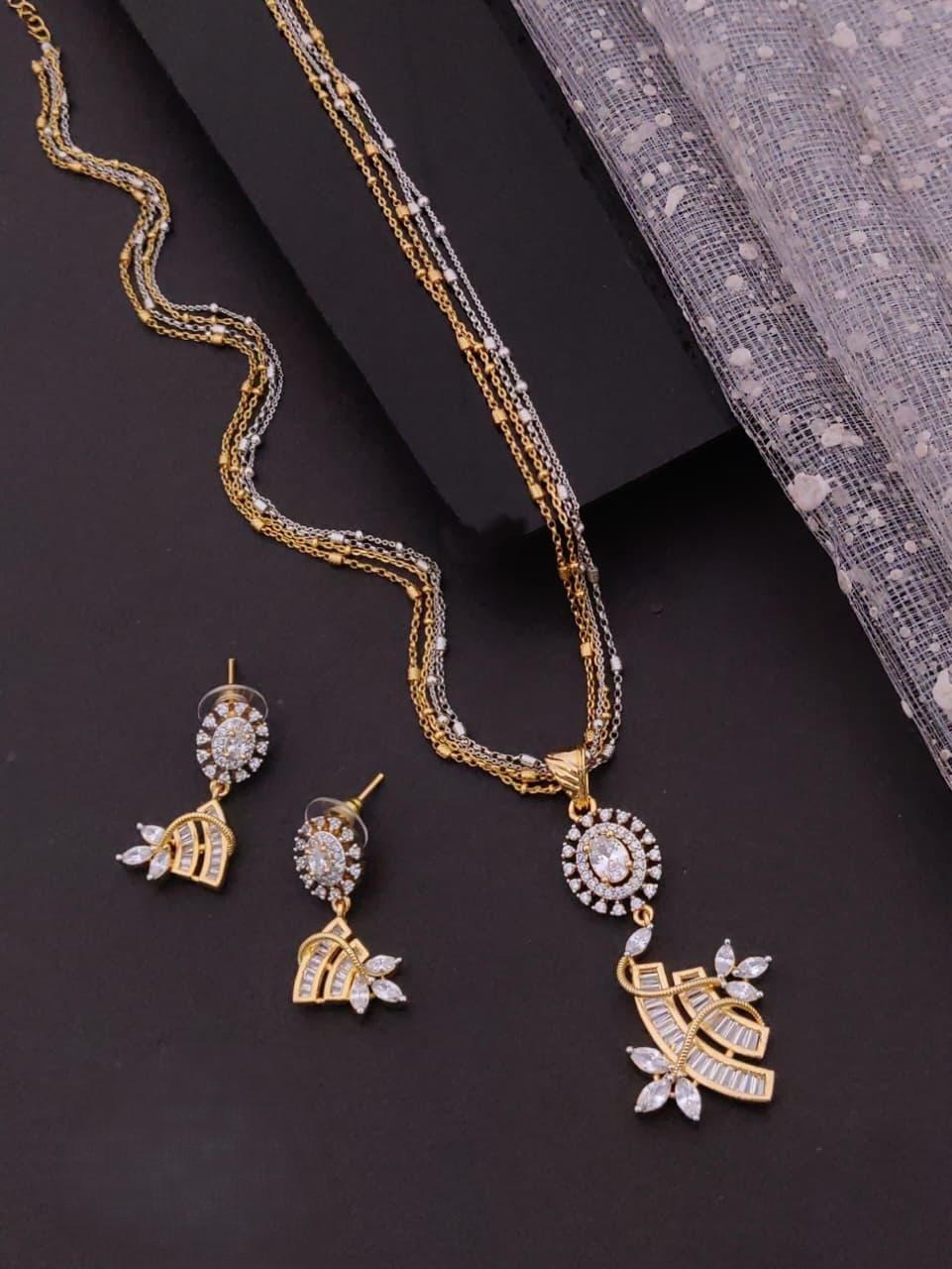 A chic necklace set featuring a dual-tone layered chain paired with a sparkling pendant and matching earrings, beautifully accented with American diamonds for an elegant modern touch.