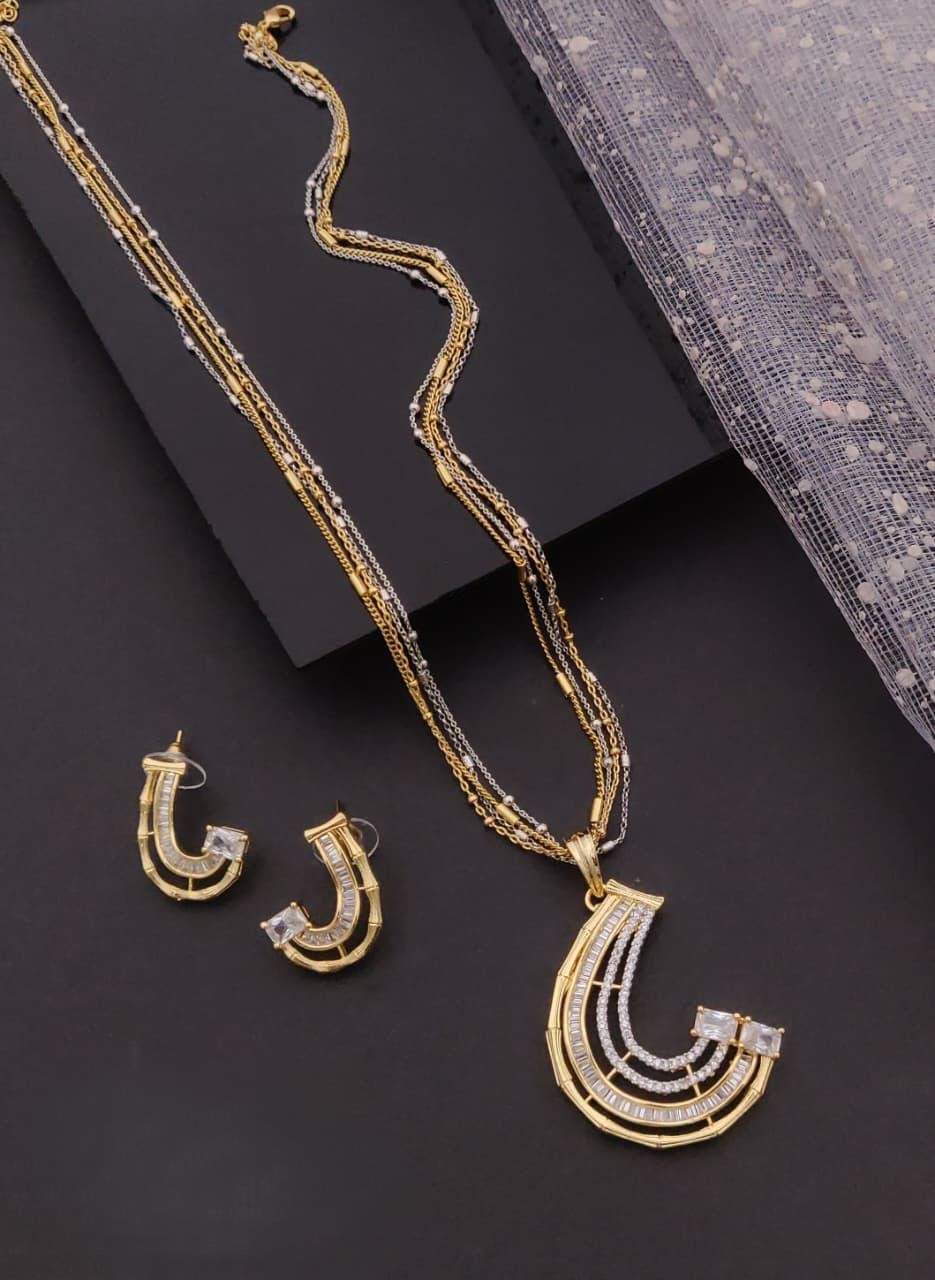 A chic necklace set featuring a dual-tone layered chain paired with a sparkling pendant and matching earrings, beautifully accented with American diamonds for an elegant modern touch.