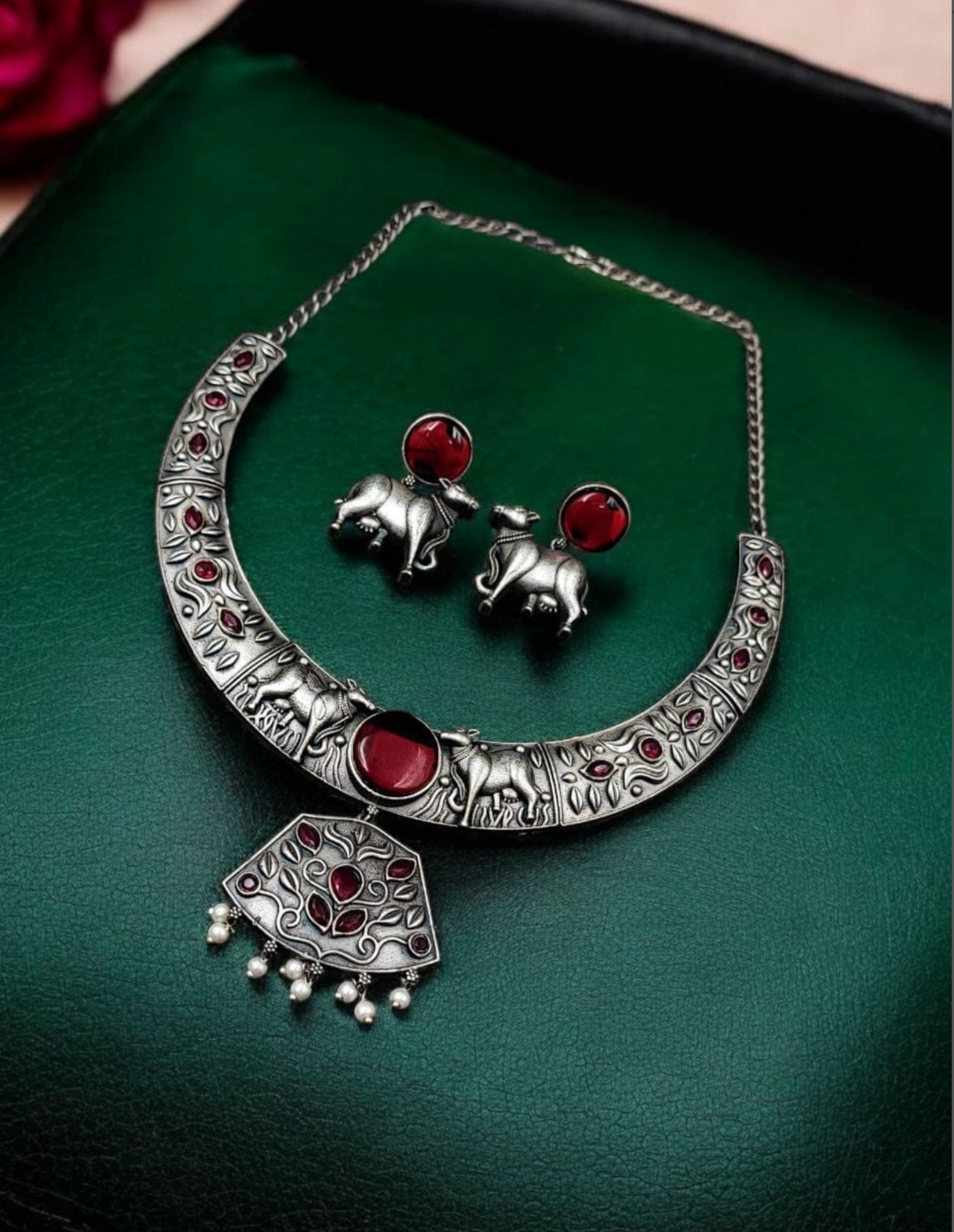 A versatile oxidised jewellery set featuring a beautifully crafted neckpiece and matching earrings. Perfect for adding a touch of contemporary elegance to any outfit, ideal for casual gatherings or festive occasions.
