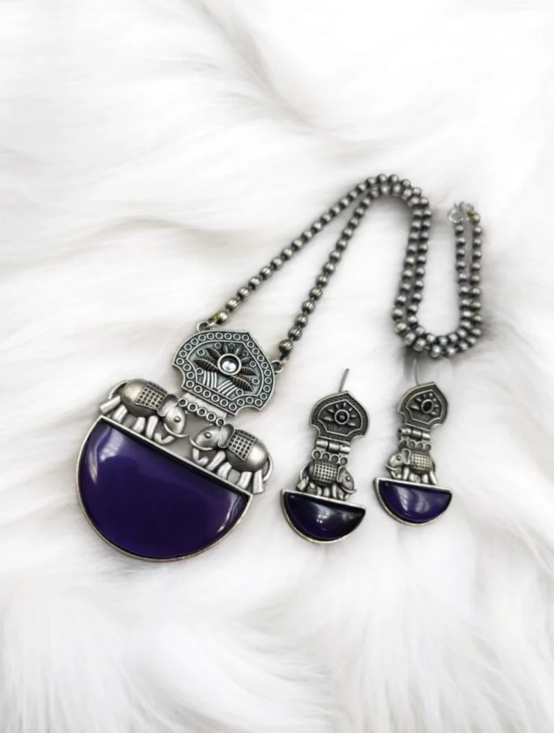 A versatile oxidised jewellery set featuring a beautifully crafted neckpiece and matching earrings. Perfect for adding a touch of contemporary elegance to any outfit, ideal for casual gatherings or festive occasions.