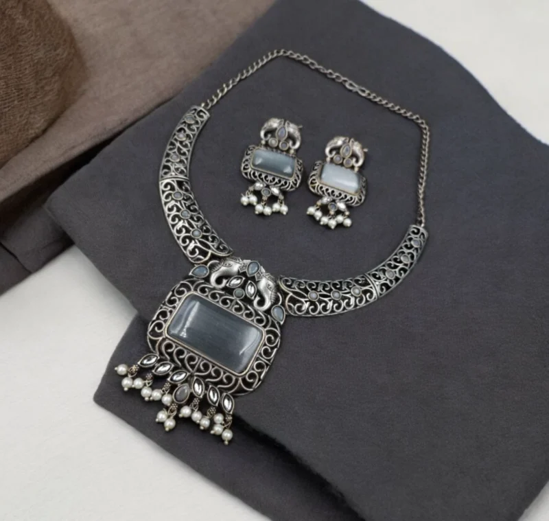 A versatile oxidised jewellery set featuring a beautifully crafted neckpiece and matching earrings. Perfect for adding a touch of contemporary elegance to any outfit, ideal for casual gatherings or festive occasions.