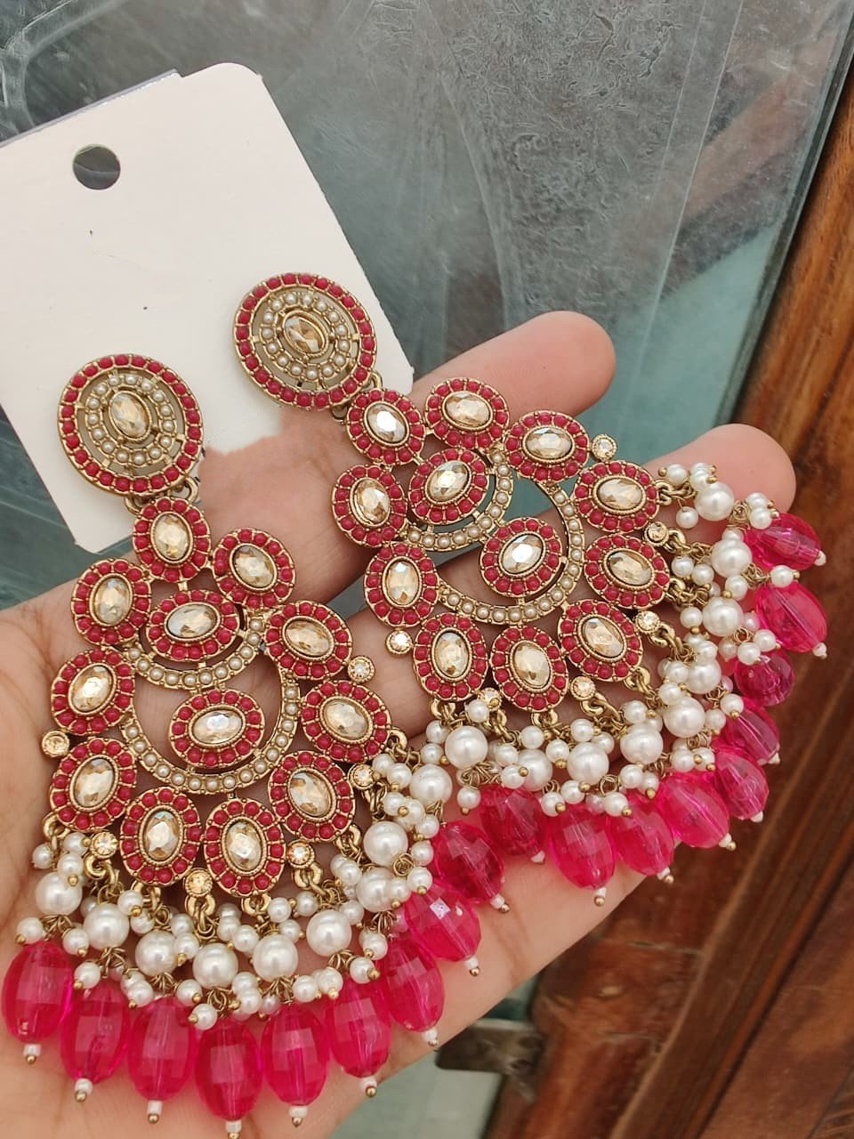 Elegant Kundan Chandbali Earrings adorned with ruby-tone stones, pearl detailing, and pink bead drops—perfect for adding a royal festive touch to any traditional look.