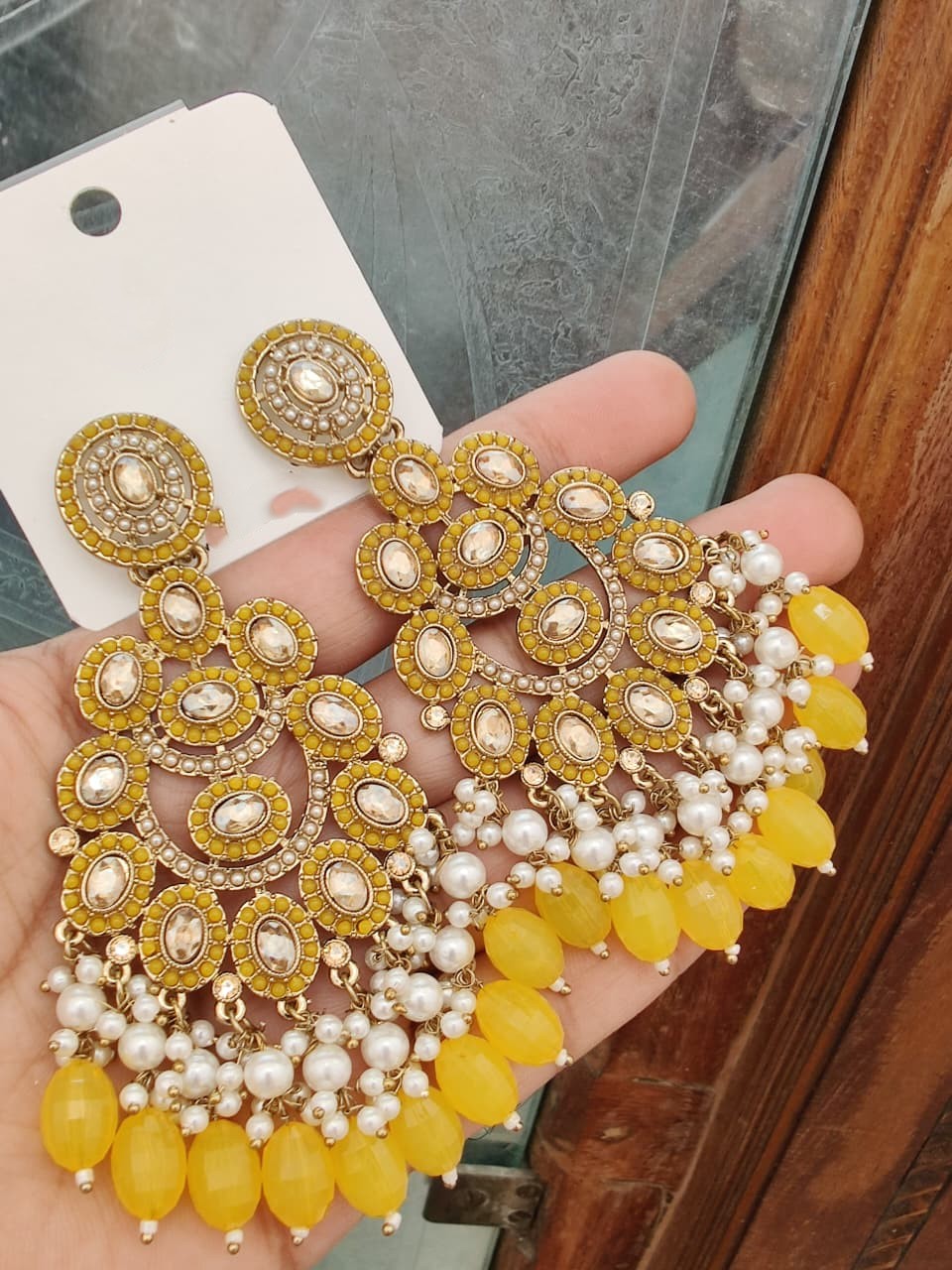 Elegant Kundan Chandbali Earrings adorned with ruby-tone stones, pearl detailing, and pink bead drops—perfect for adding a royal festive touch to any traditional look.