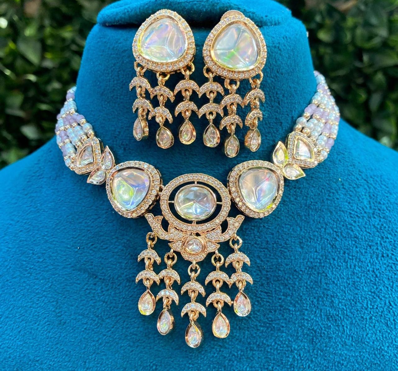 A luxurious American Diamond choker set featuring iridescent stones, layered bead strands, and elegant dangling drops. Paired with matching earrings, it adds a glamorous and high-fashion sparkle to any special occasion look.