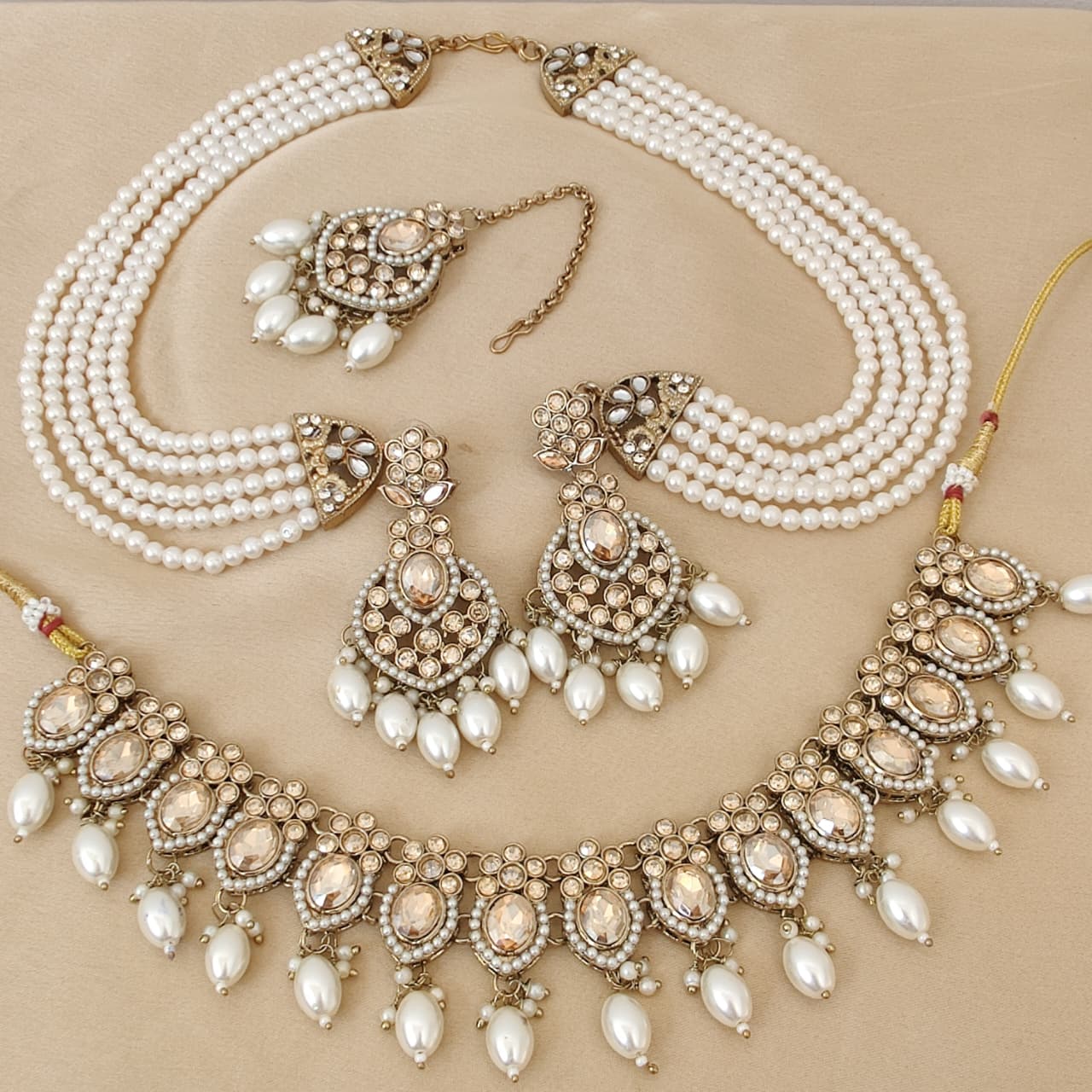 A luxurious bridal jewellery set featuring classic Kundan work paired with layered pearl strings. The intricate Kundan detailing, statement jhumkas, and matching maang tikka add a regal and elegant charm—perfect for weddings and grand festivities.