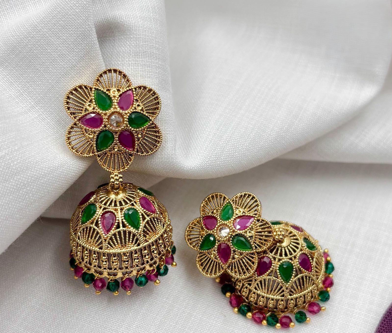 Elegant Kundan jhumka earrings featuring floral tops, gold-tone finish, and delicate hanging beads—perfect for festive and bridal wear.