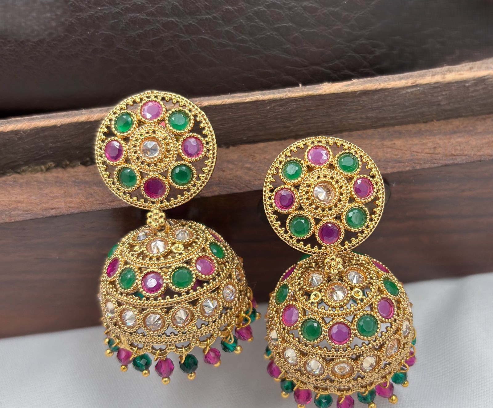 Elegant Kundan jhumka earrings featuring floral tops, gold-tone finish, and delicate hanging beads—perfect for festive and bridal wear.