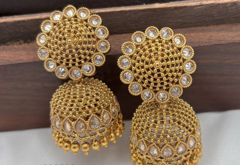 Elegant Kundan jhumka earrings featuring floral tops, gold-tone finish, and delicate hanging beads—perfect for festive and bridal wear.