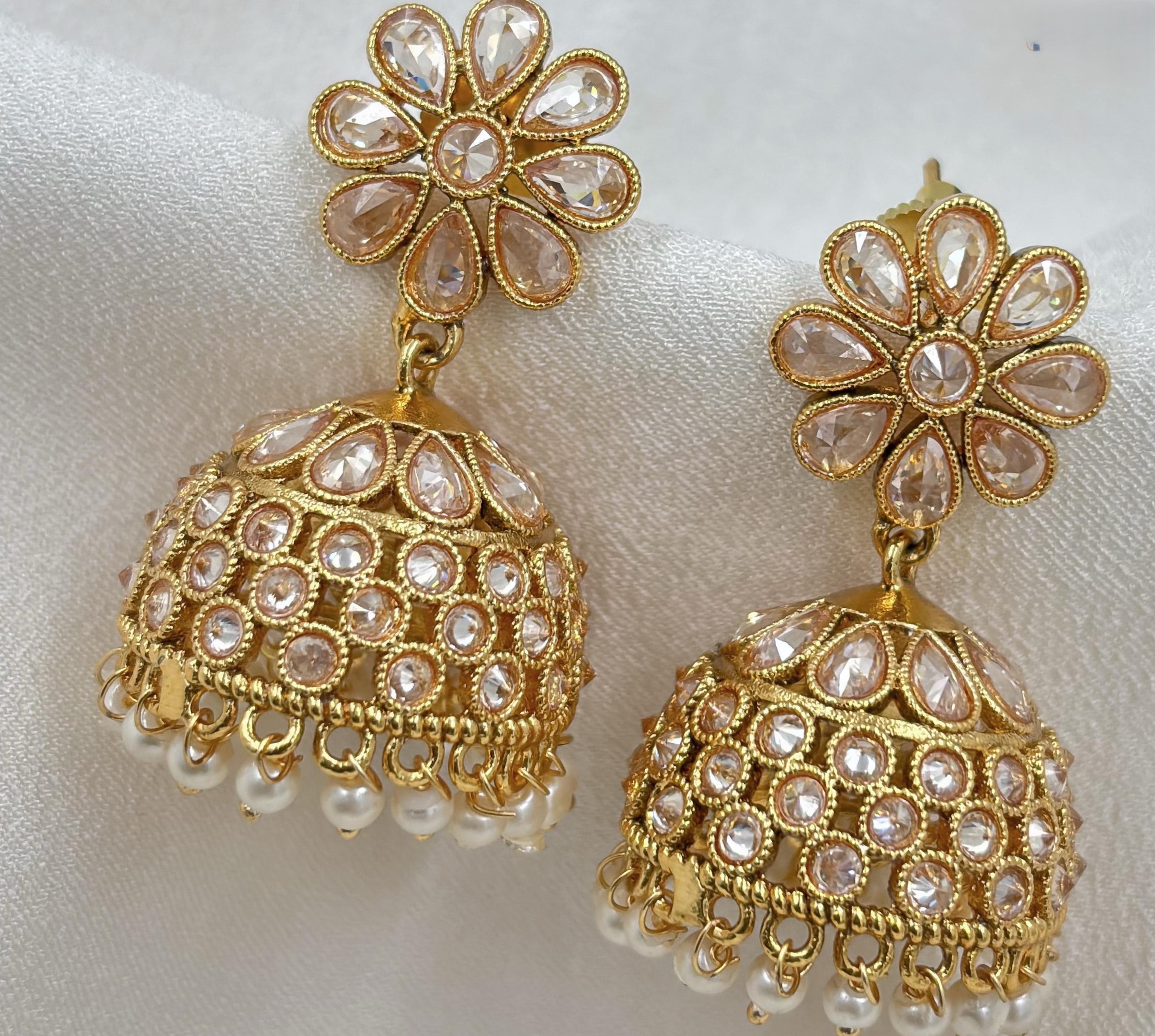 Elegant Kundan jhumka earrings featuring floral tops, gold-tone finish, and delicate hanging beads—perfect for festive and bridal wear.