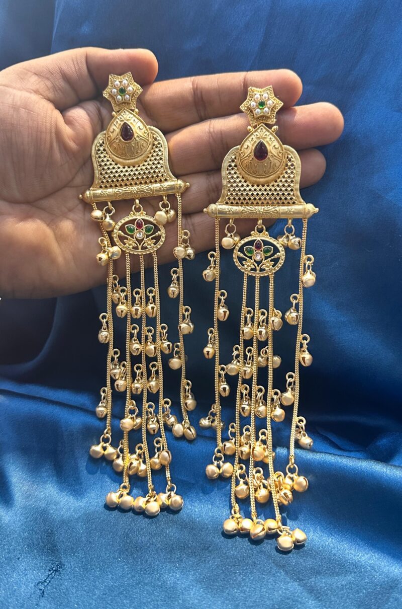 Beautiful long tassel earrings with intricate detailing, colourful accents, and cascading chains—perfect for adding a bold and traditional touch to festive outfits.