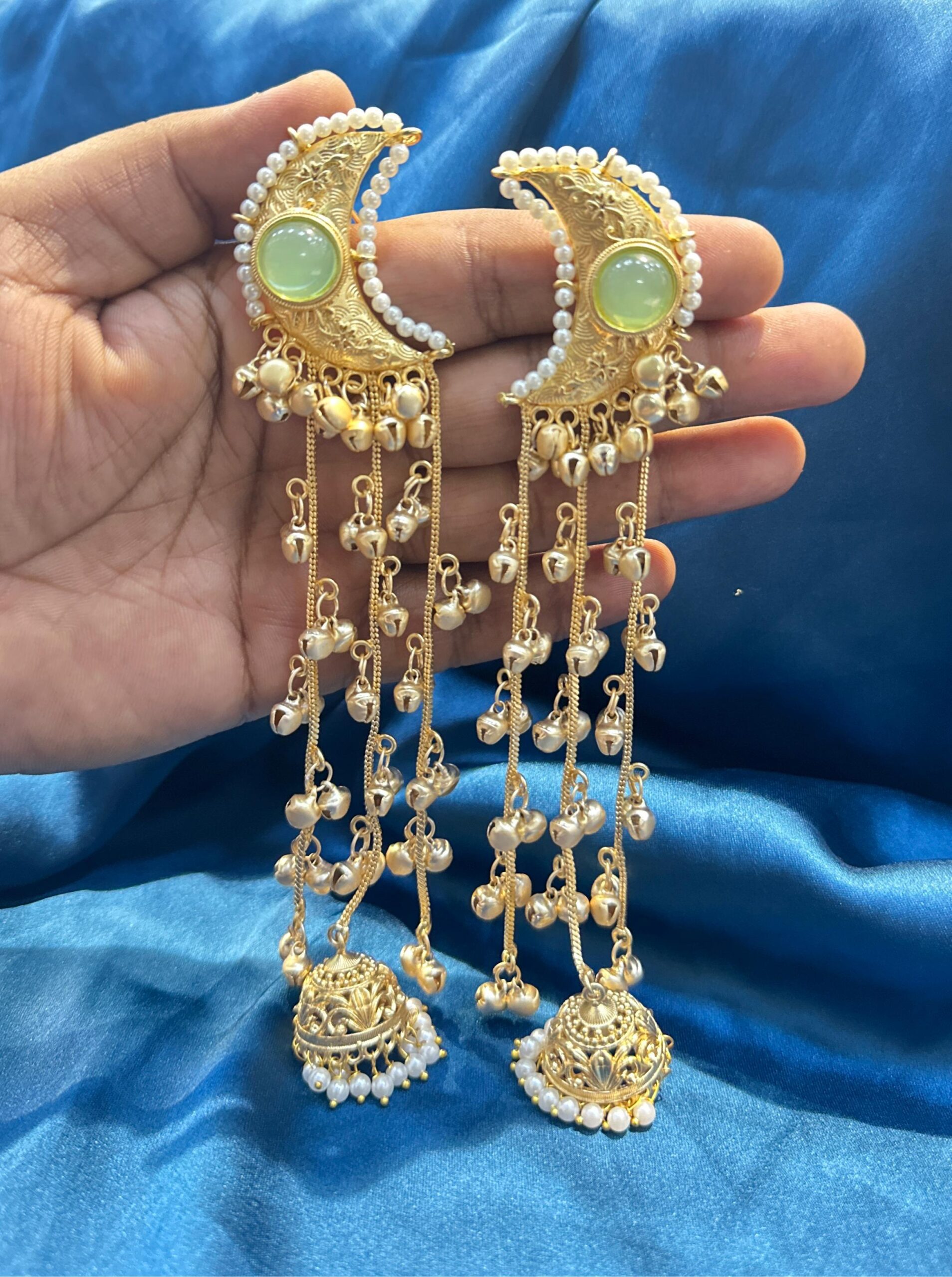 Beautiful long tassel earrings with intricate detailing, colourful accents, and cascading chains—perfect for adding a bold and traditional touch to festive outfits.