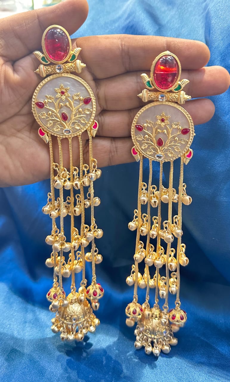 Beautiful long tassel earrings with intricate detailing, colourful accents, and cascading chains—perfect for adding a bold and traditional touch to festive outfits.