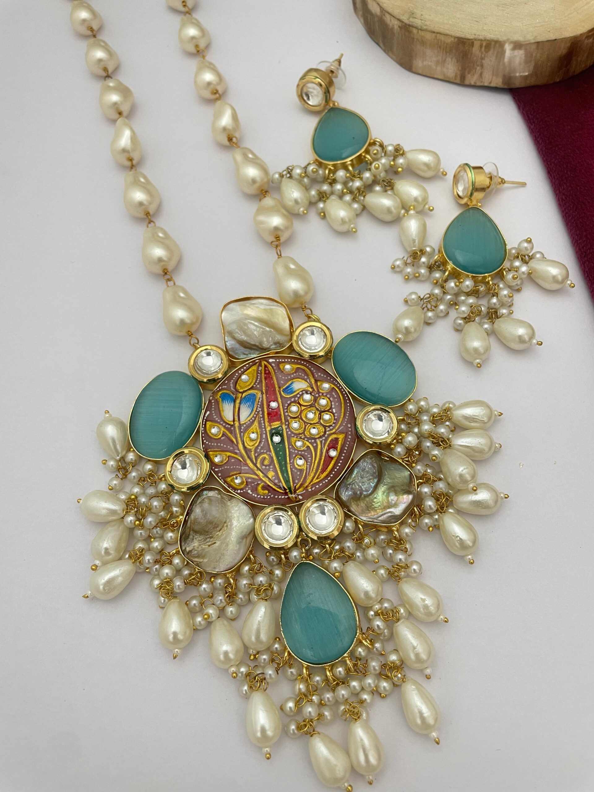 A beautifully handcrafted enamel Kundan necklace set adorned with aqua stones, pearl droplets, and intricate artwork at the center. Paired with matching earrings, this statement piece adds a rich, regal charm to any festive or traditional look.