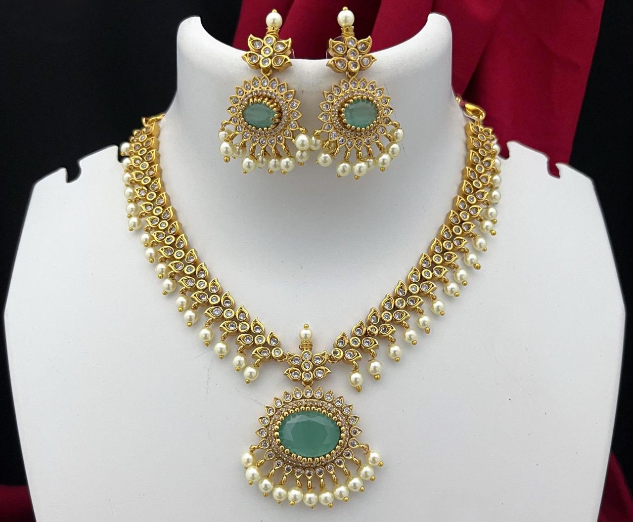 An elegant traditional Indian jewellery set crafted in gold-tone finish, featuring kundan-style stones and delicate pearl drops. The necklace has a classic crescent design with a statement pendant, paired with matching floral earrings—perfect for weddings, festive occasions, and bridal wear.