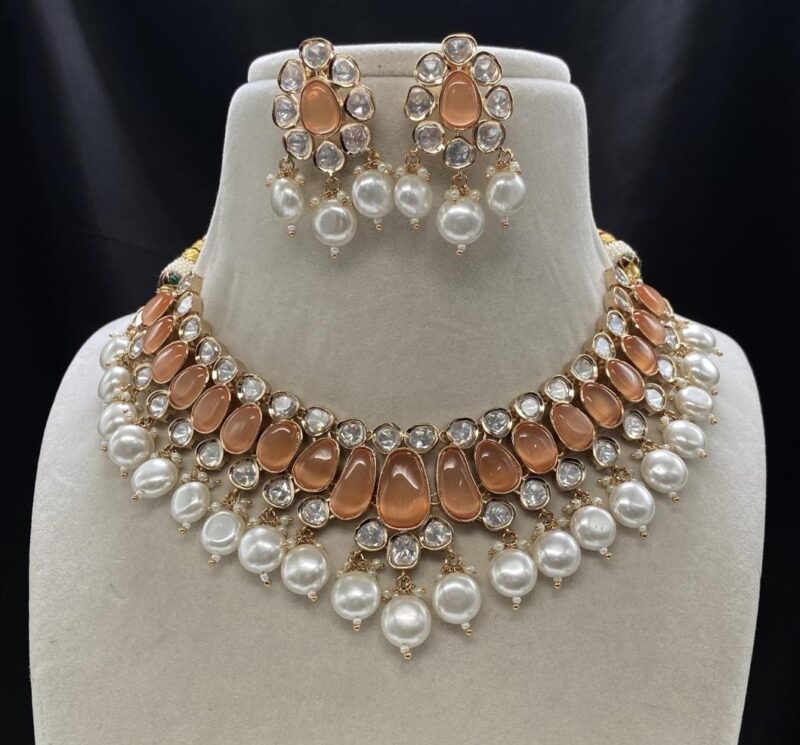 A chic fusion jewellery set featuring peach-toned stones, classic kundan crystals, and elegant pearl drops in a gold-finish base. The bold yet graceful design makes it perfect for festive occasions, weddings, and modern ethnic looks.