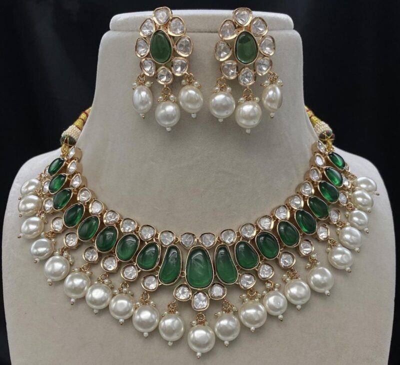 A chic fusion jewellery set featuring peach-toned stones, classic kundan crystals, and elegant pearl drops in a gold-finish base. The bold yet graceful design makes it perfect for festive occasions, weddings, and modern ethnic looks.