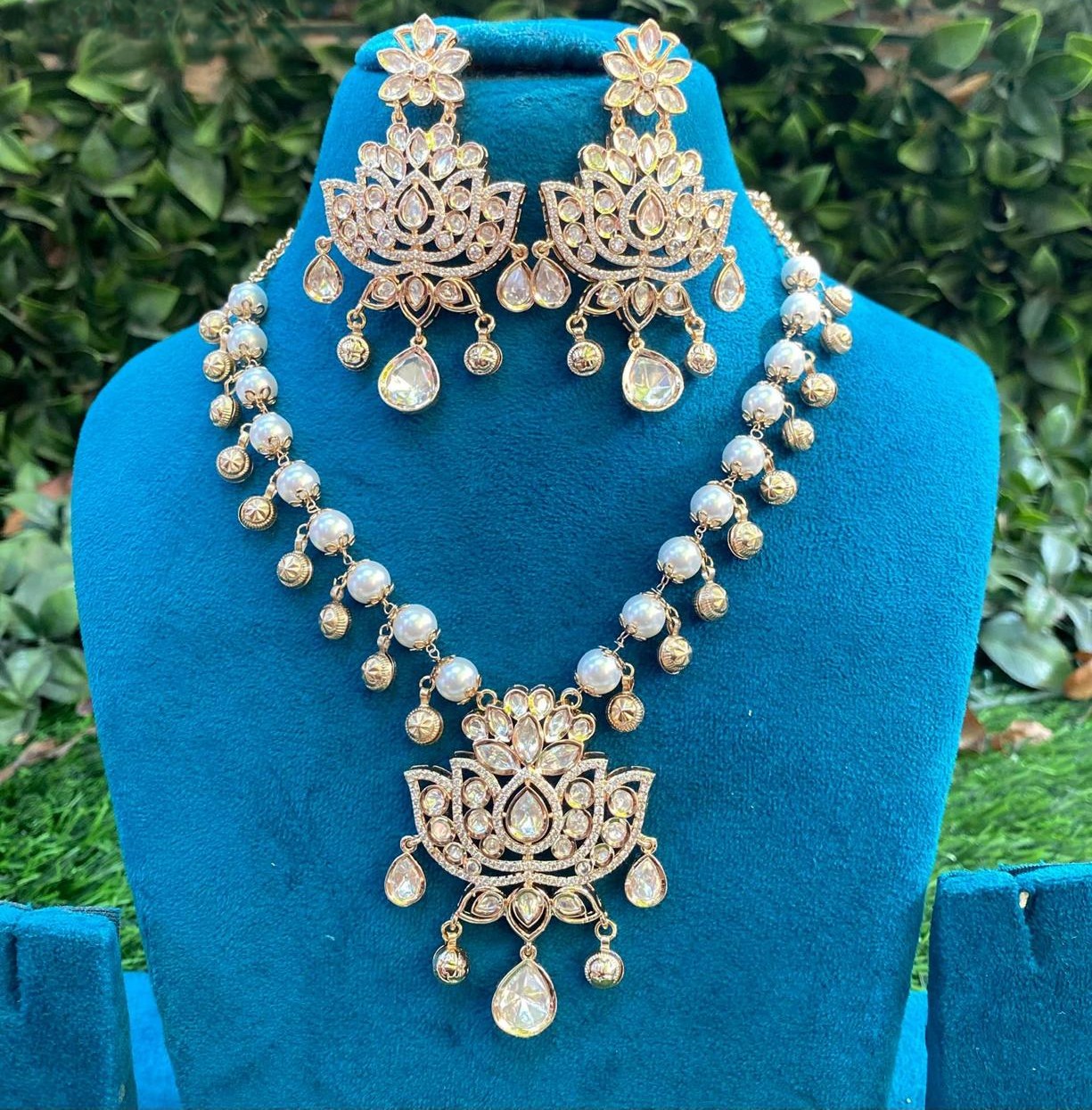 A luxurious gold-finish jewellery set featuring intricately arranged kundan stones in a regal lotus-inspired design, highlighted with pearl accents and dangling crystal drops. Paired with ornate chandelier earrings, this elegant set is perfect for bridal wear, weddings, and grand festive occasions.