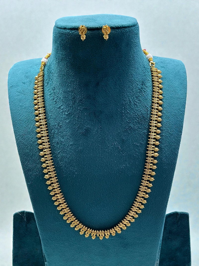 A graceful long necklace set designed with multi-layer pearls and a beautifully crafted Kundan pendant featuring rich red enamel work. Paired with matching earrings, this elegant piece adds a royal and timeless touch to festive and traditional outfits.