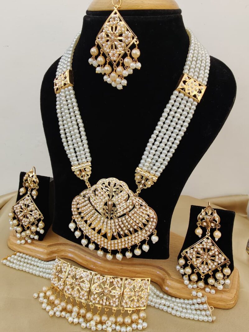 A graceful long necklace set designed with multi-layer pearls and a beautifully crafted Kundan pendant featuring rich red enamel work. Paired with matching earrings, this elegant piece adds a royal and timeless touch to festive and traditional outfits.