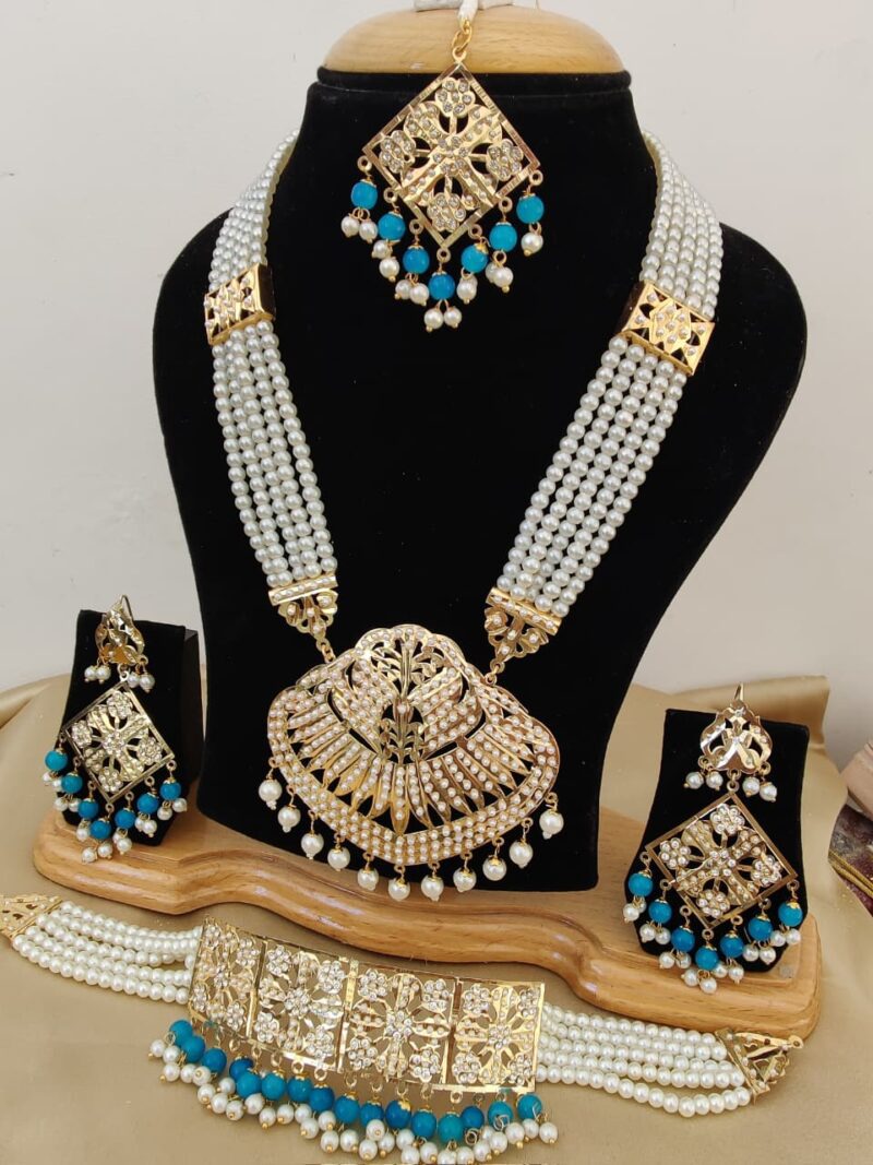 A graceful long necklace set designed with multi-layer pearls and a beautifully crafted Kundan pendant featuring rich red enamel work. Paired with matching earrings, this elegant piece adds a royal and timeless touch to festive and traditional outfits.