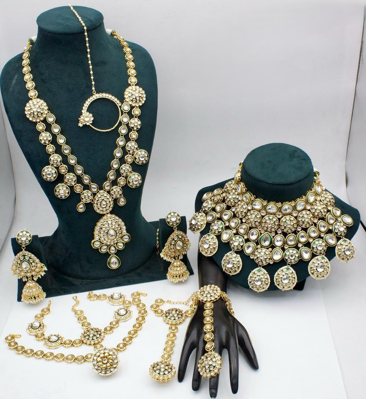 A complete bridal kundan jewellery set featuring a choker, long necklace, and matching accessories, perfect for weddings and grand festive looks.