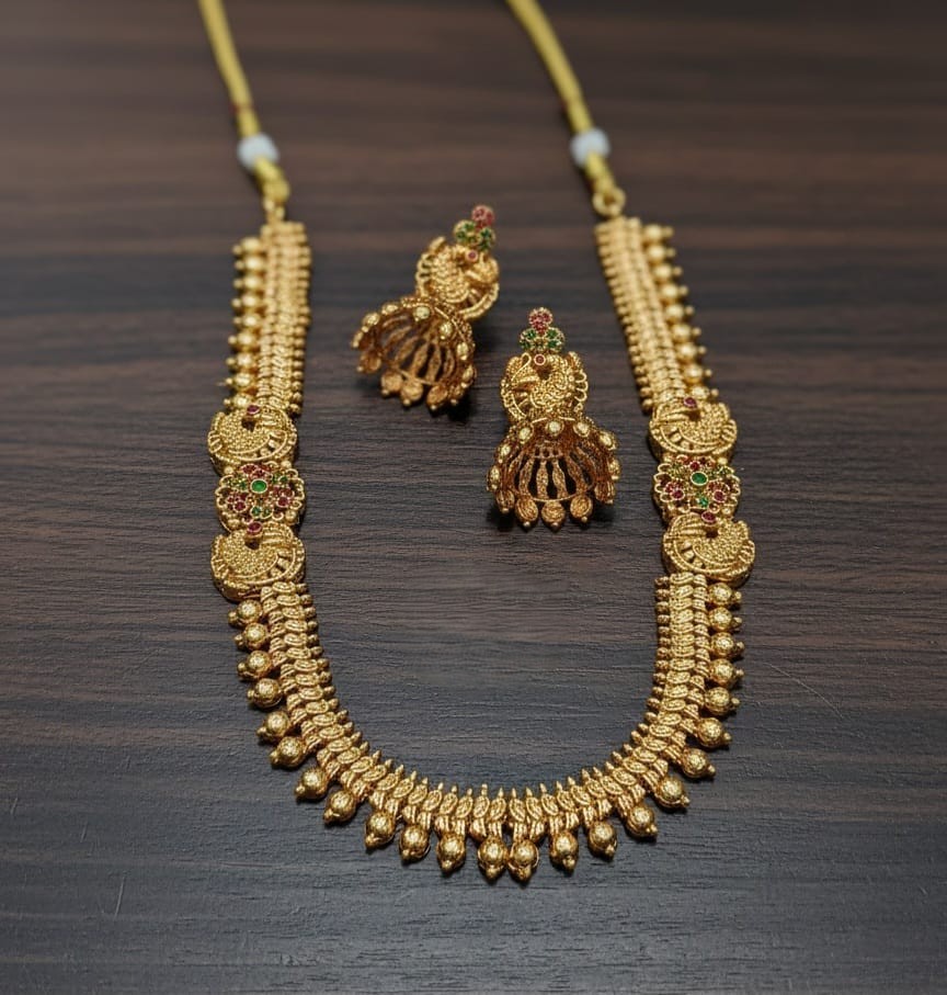 An elegant traditional necklace set with geometric detailing and refined accents, paired with matching earrings for a graceful festive look.