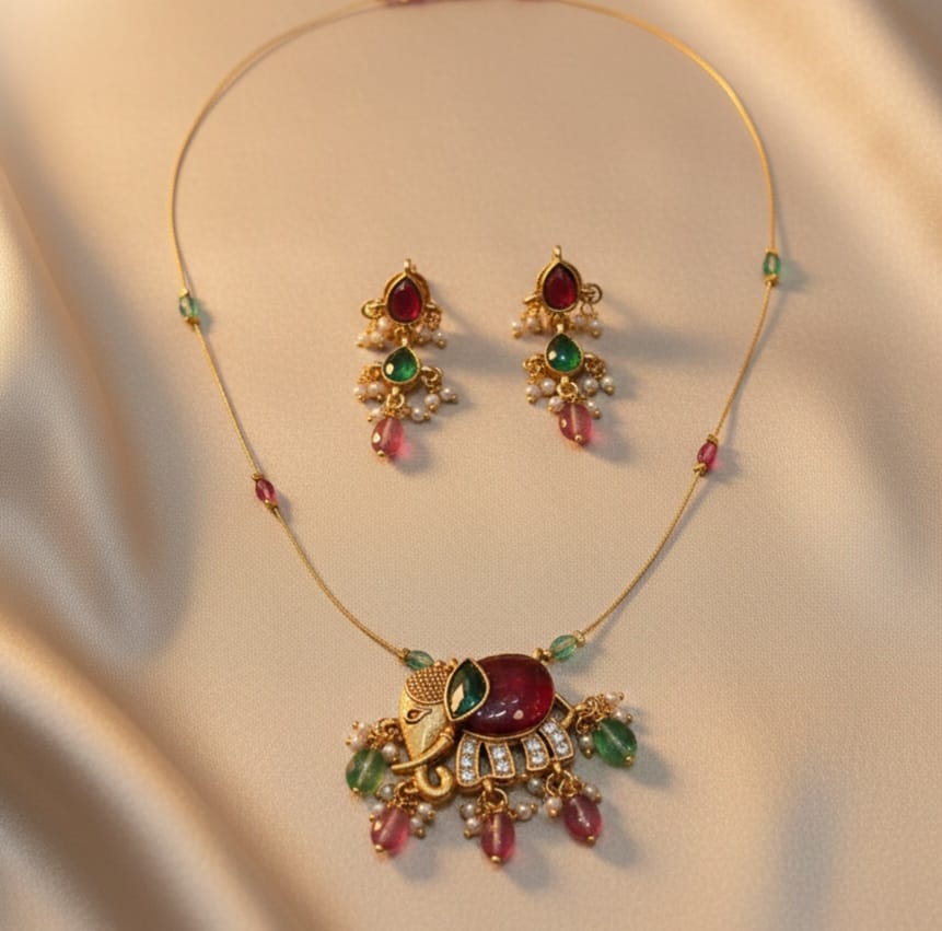 Elegant necklace set featuring a delicate chain with a statement pendant, highlighted by rich red tones and pearl detailing, paired with matching earrings for a graceful, festive look.