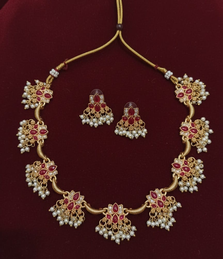 A delicately designed necklace set featuring intricate detailing and elegant pearl hangings. Paired with matching earrings, it adds a graceful traditional charm to any festive or ethnic look.