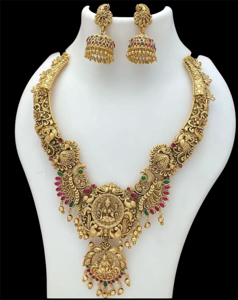 Elegant Kundan Temple necklace set designed with fine craftsmanship, giving a regal and timeless appeal for any ethnic outfit.