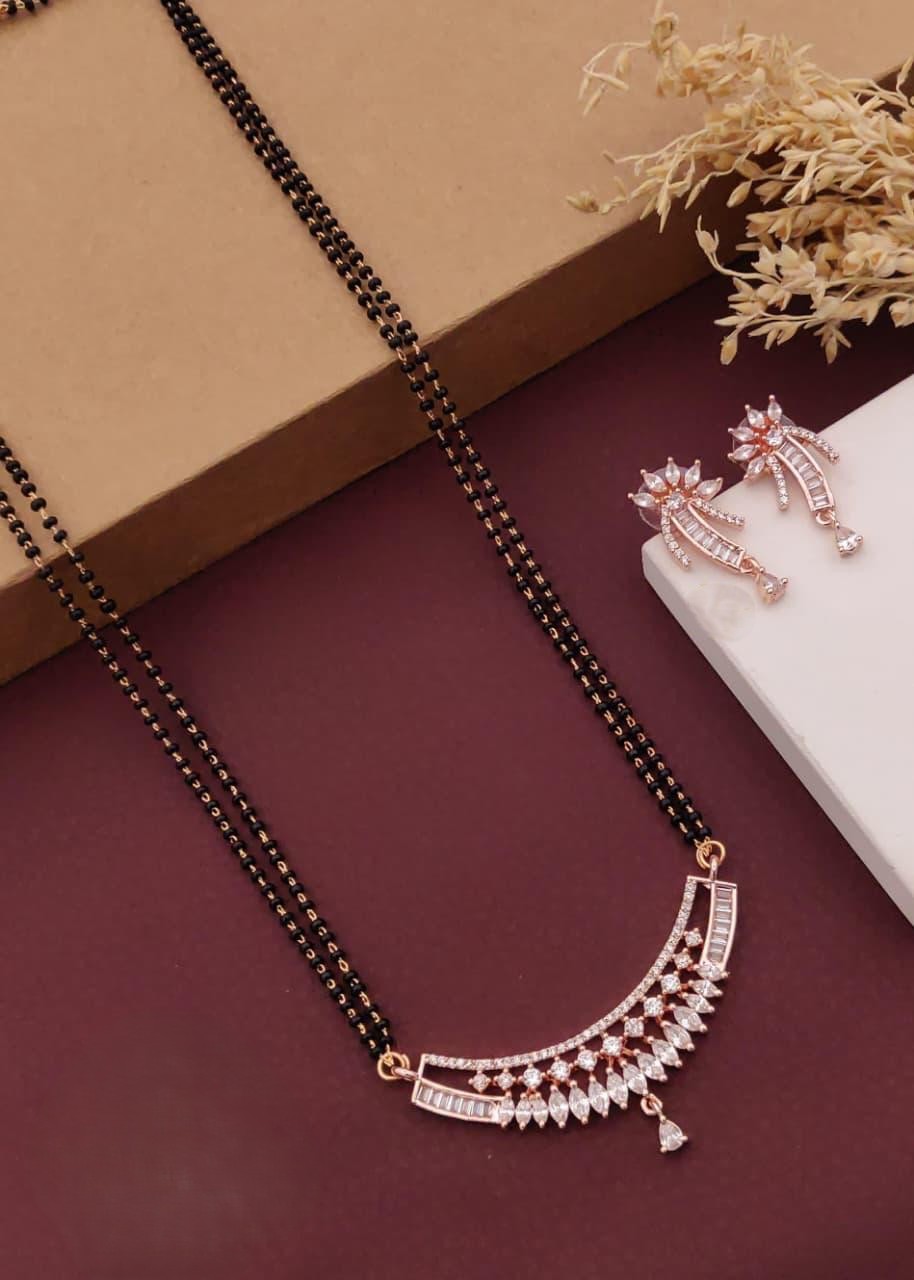 Lightweight daily-wear mangalsutra with a contemporary AD pendant and earrings for a graceful finish.