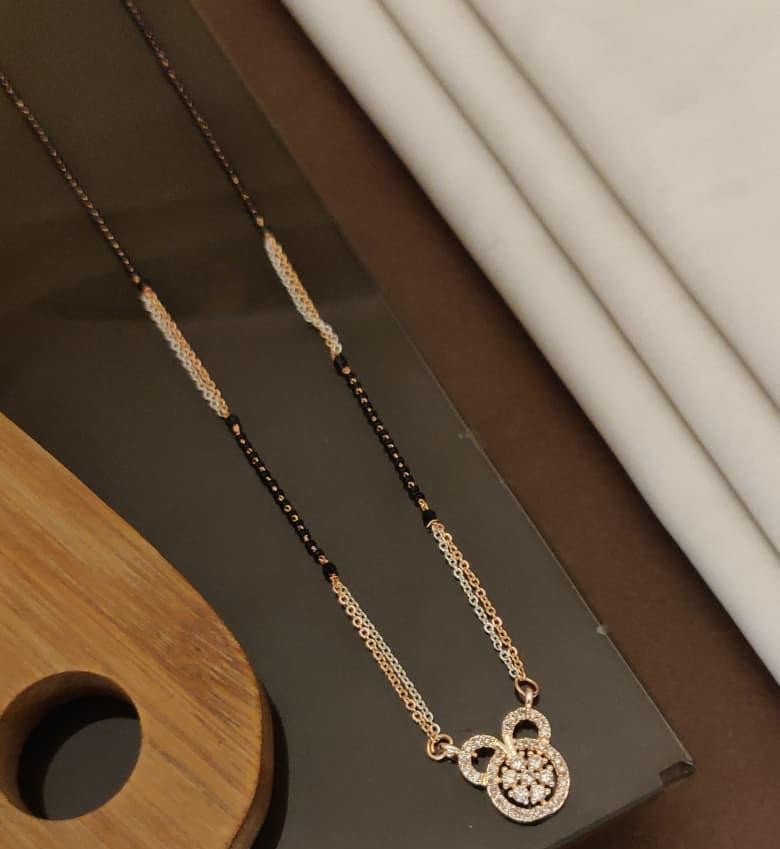 Lightweight daily-wear mangalsutra with a contemporary AD pendant and earrings for a graceful finish.