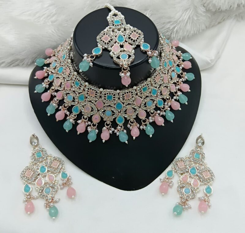 A delicately designed necklace set featuring intricate detailing and elegant. Paired with matching earrings and maangtika, it adds a graceful traditional charm to any festive or ethnic look.