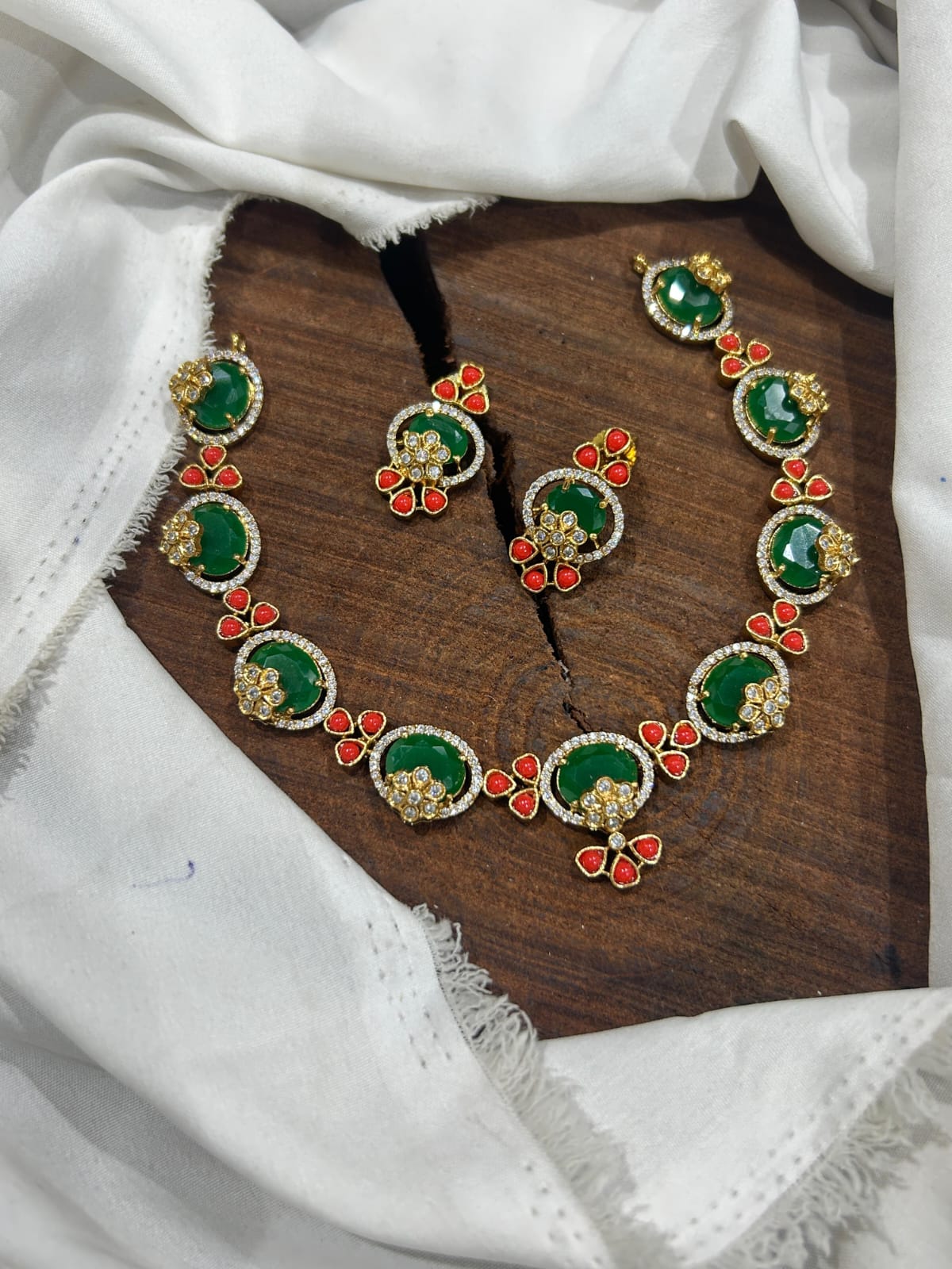An elegant AD necklace set featuring emerald-green stones accented with sparkling American diamonds and red enamel details, perfect for festive and party wear.