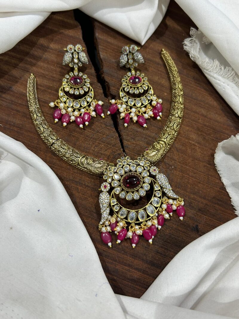 An elegant AD necklace set featuring emerald-pink stones accented with sparkling American diamonds details, perfect for festive and party wear.