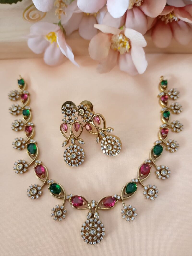 A graceful American Diamond necklace set adorned with pink and green stones, highlighted by sparkling AD accents—perfect for elegant festive and party looks.