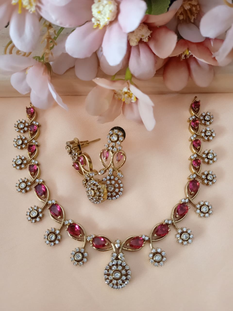 A graceful American Diamond necklace set adorned with pink stones, highlighted by sparkling AD accents—perfect for elegant festive and party looks.